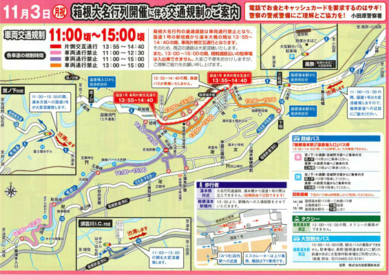 当日は箱根湯本駅周辺の交通規制が行われ、周辺の道路は大変混雑します。お時間に余裕をもってお出掛けください。